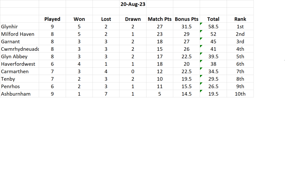 Apologies all – I made a transcription error in awarding Haverfordwest only 2 match points instead of 4 in their winning home match Vs Milford. Apologies to all and the updated table is as follows. Overall positions do not change however.